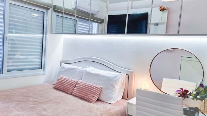 • Cama box baú queen, persiana blackout e luminárias decorativas modernas