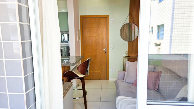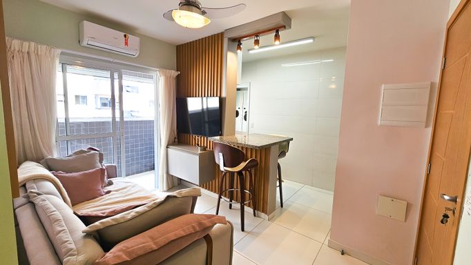 A poucos metros da praia, este belíssimo apartamento de 42m² é novíssimo, com apenas 1 ano e meio desde a entrega do prédio, e está totalmente mobiliado e decorado com extremo bom gosto — pronto para você entrar e morar!
